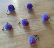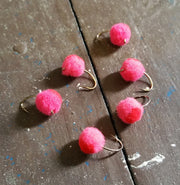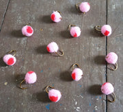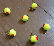The blood dot egg is a yarn fly that imitates trout and salmon eggs. When the yarn makes contact with the water it becomes a little translucent and looks even more like a real egg than it does when it is dry. The dot provides contrast and represents a developing fish fry. All sorts of fish eat eggs but these flies are especially effective for trout and salmon. Both wild fish and stocked fish will hit these flies even when fish are not actually laying eggs.