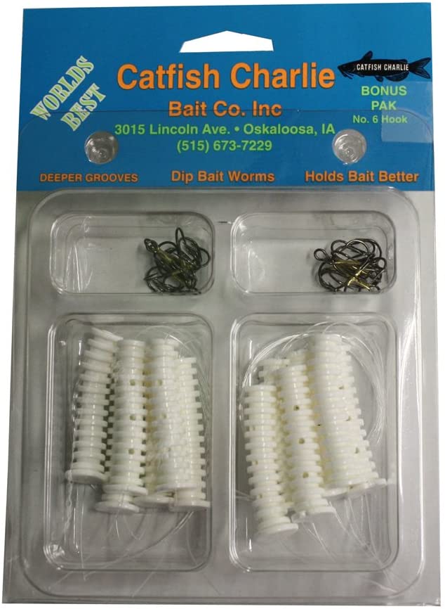 These plastic worms are specifically made to hold catfish dip bait. Catfish Charlie worms have deeper groves and hold bait better than the rest.