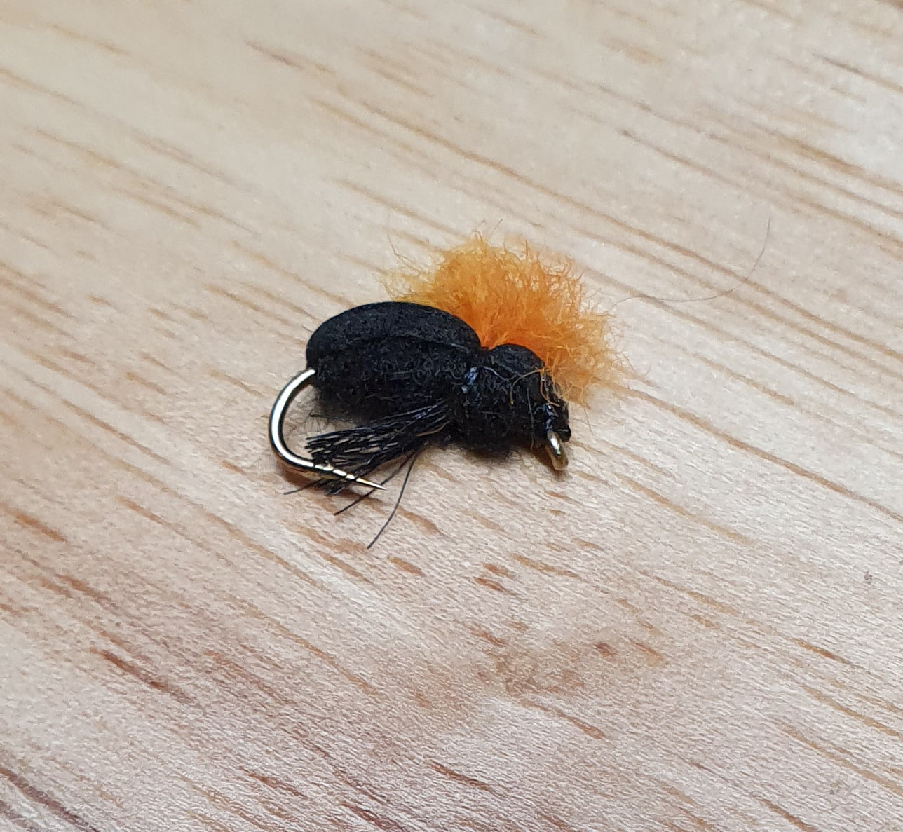 The foam beetle floats high and catches fish. The orange tuft on top helps you find the fly on the water.